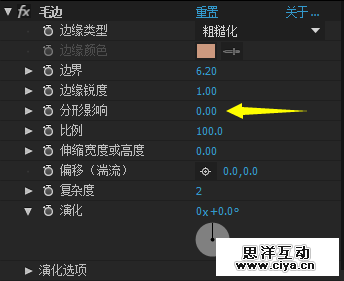 步骤3:给合成添加一个调节图层,放在最上面。然后给调节图层添加一个[毛边]效果,注意要把“分形影响”的参数调成“0”。