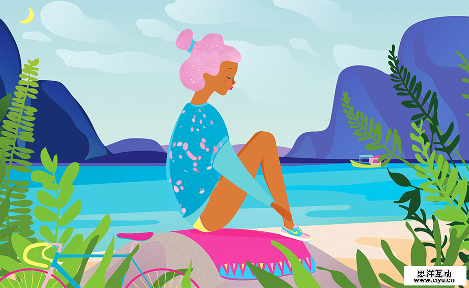 蓝色与多种颜色相搭配,尽量选中一个作为主色,比如上图中以蓝色作为主色,无论是远山天空还是河流,包括人物的衣服都是蓝色,与此同时,粉红作为点睛色。画面虽然大量运用蓝色,会偏向冷调,但此处运用了红色、黄色和偏暖的绿色就让画面的颜色达到了平衡。