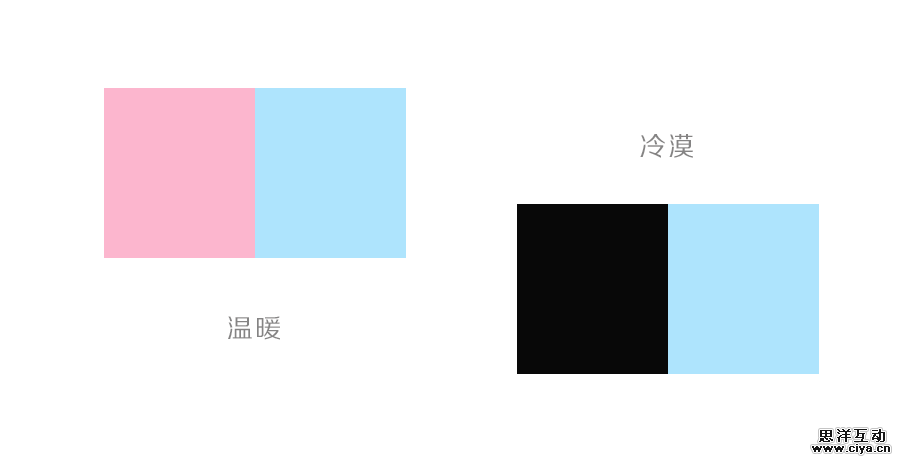 此外,即便蓝色的明度较高,如果与其他配色的明度差异较大的话,也会给人以消极的感觉。比如,天蓝色和粉红色配色,可以传达温暖的感觉,但天蓝色与黑色配色,则会传递出由于和冷漠的感觉。