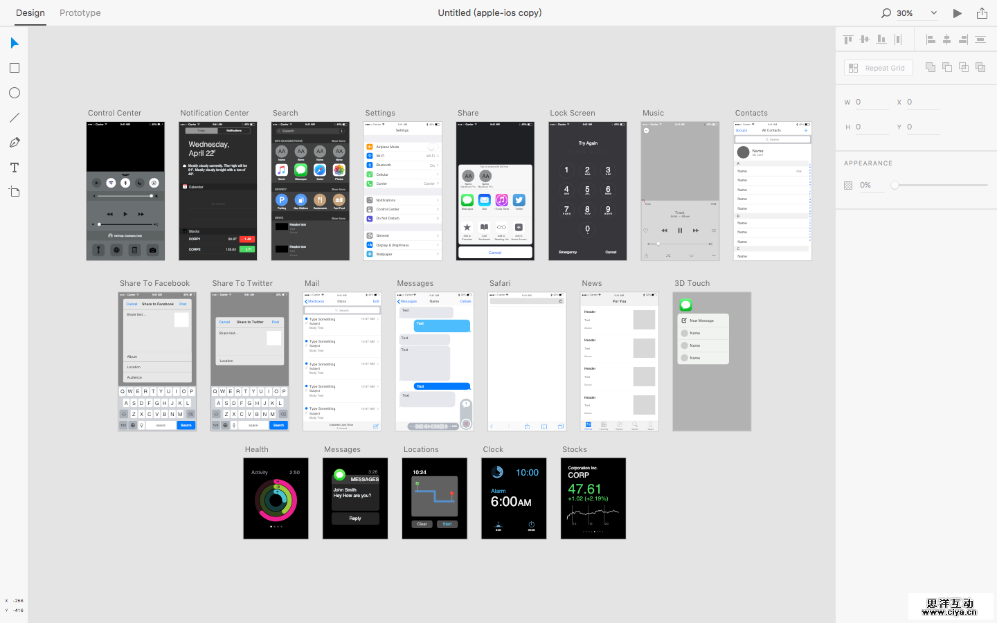 可以看到支持的设备与尺寸还是比较丰富的,同时还自带了一些常用的UI Kits,比如 iOS、Google Material 等。这样就可以帮助设计师快速从素材库选取内容搭建页面,十分方便。