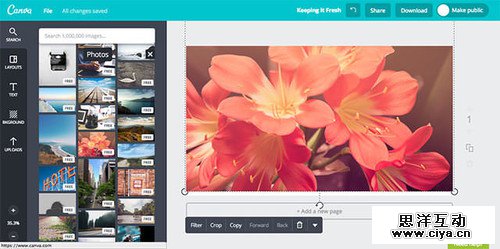 在实践的样本中试试看,将学到的这些技术,运用到自己的设计之中吧。利用Canva ,要先注册才能使用,如果嫌麻烦可以试试PS里的模糊效果,也很不错呢。这个网络工具,可以十分简单的给你的照片添加上模糊效果。首先,让我们来选择照片吧。(上传你自己喜欢的照片,或者从网站中选择免费的照片。)