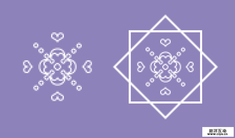 仍然是从自带的矢量图形中找到心形,然后将心形摆放在四角。同时用两个矩形加以重叠,其中一个矩形旋转45度。矩形为空心填充,描边是白色描边2px。