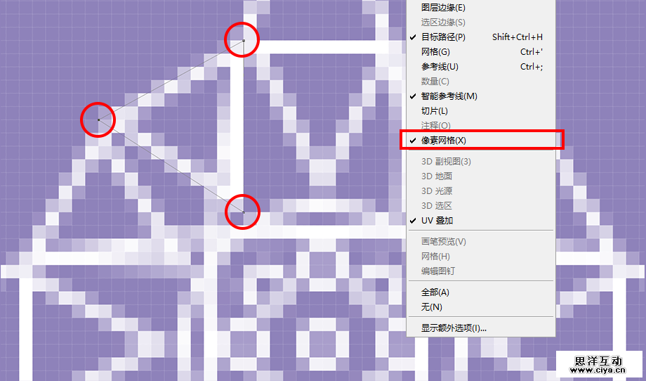 这时运用直接选择工具,选择其中一个三角形的锚点,将每个锚点对齐像素网格。这样做的目的是为了让图形保持精细,利用像素网格是一个不错的选择。像素网格是在当你放大图形能看到像素的时候出现的,如果还没有出现,请在【视图>显示>像素网格】中勾选打开。按照这一方式将所有的三角形的锚点都与像素网格对齐。