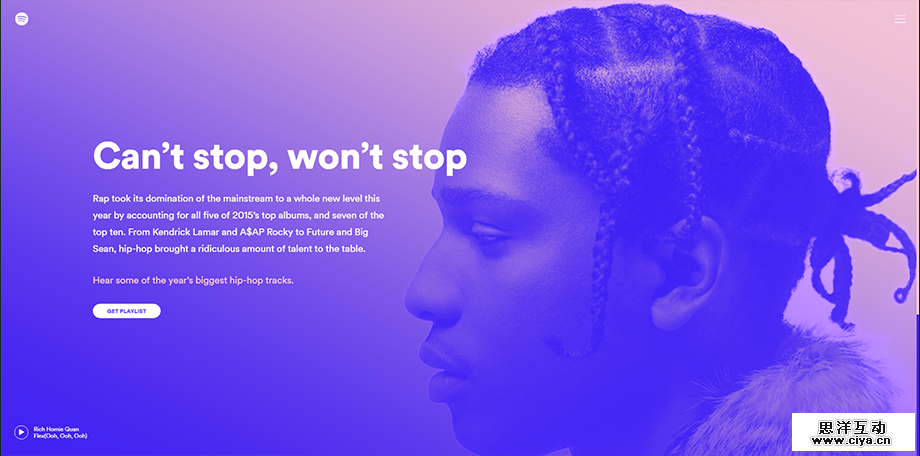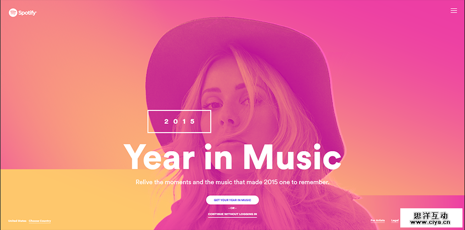 可以看出这一案例中,网页已经让渐变成为了一种设计元素。霸占整个屏幕的图片充满震撼,而让其也参与到过度的渐变中,让图片散发出霓虹灯一样的效果,搭配幽灵按钮,这几乎是信手拈来的绝佳创意。