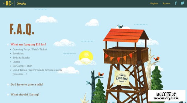 网站Barcamp Omaha 2014 在连续滚动的页面区域,采用了大量不同的颜色。最突出的一点是,文本设计很好地融入到每一个背景部分。页面上对比度最大的,往往是图形或按钮。你可以在整个网站中都看到这种效果。