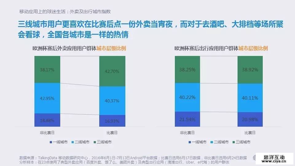 三线城市用户更喜欢在比赛后点一份外卖当宵夜,而对于去酒吧、大排档等场所聚会看球,全国各城市是一样的热情。