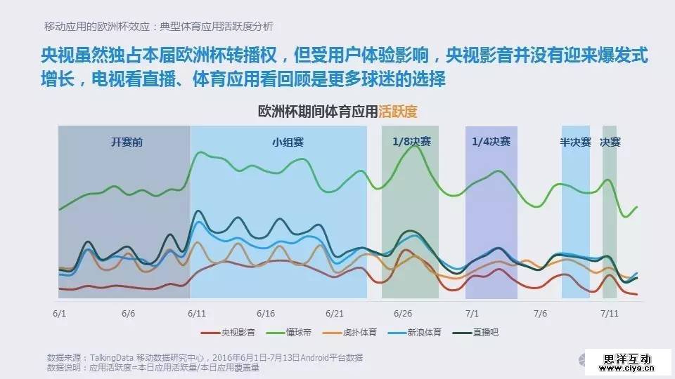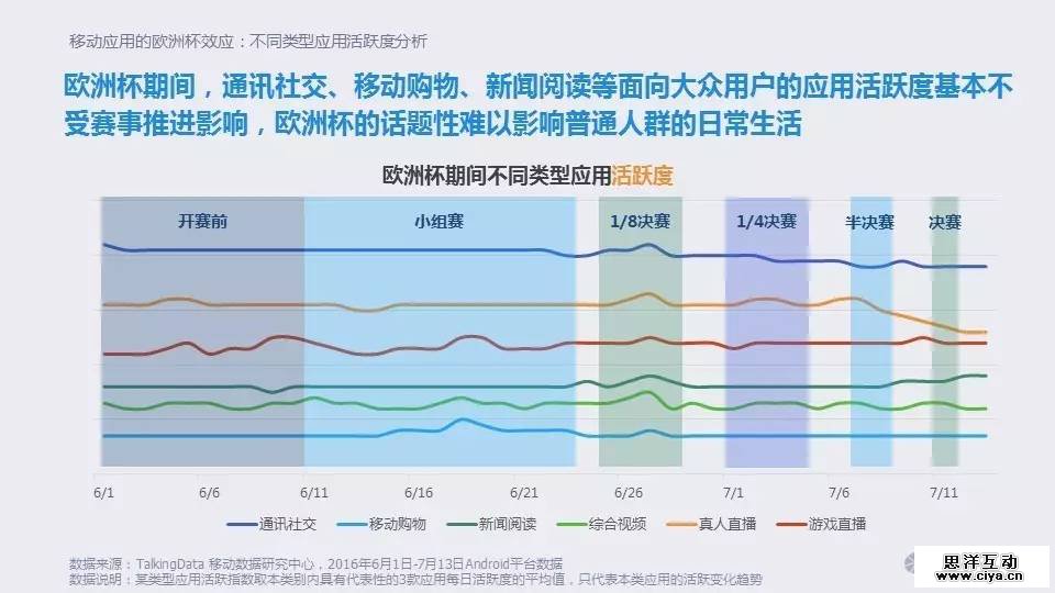 欧洲杯期间,通讯社交、移动购物、新闻阅读等面向大众用户的应用活跃度基本不受赛事推进影响,欧洲杯的话题性难以影响普通人群的日常生活。