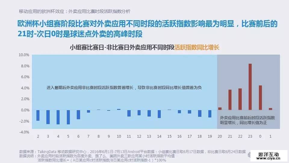 欧洲杯小组赛阶段比赛对外卖应用不同时段的活跃指数影响最为明显,比赛前后的21时-次日0时是球迷点外卖的高峰时段。