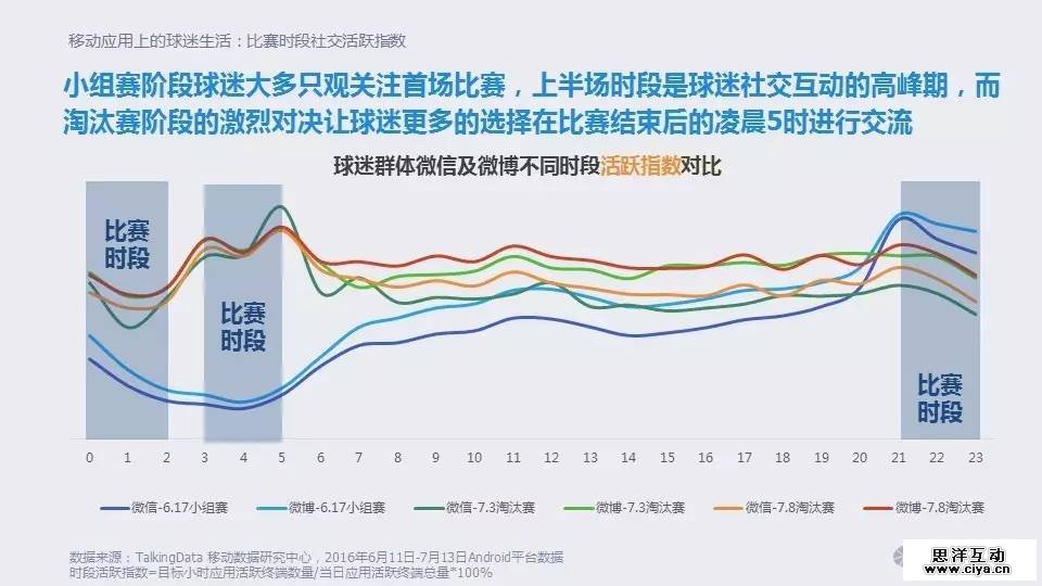 小组赛阶段球迷大多只观关注首场比赛,上半场时段是球迷社交互动的高峰期,而淘汰赛阶段的激烈对决让球迷更多的选择在比赛结束后的凌晨5时进行交流。
