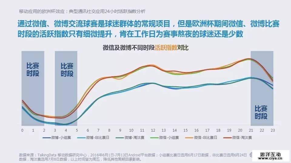 通过微信、微博交流球赛是球迷群体的常规项目,但是欧洲杯期间微信、微博比赛时段的活跃指数只有细微提升,肯在工作日为赛事熬夜的球迷还是少数。