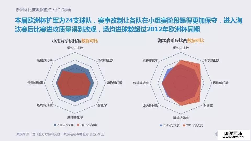 本届欧洲杯扩军为24支球队,赛事改制让各队在小组赛阶段踢得更加保守,进入淘汰赛后比赛进攻质量得到改观,场均进球数超过2012年欧洲杯同期。