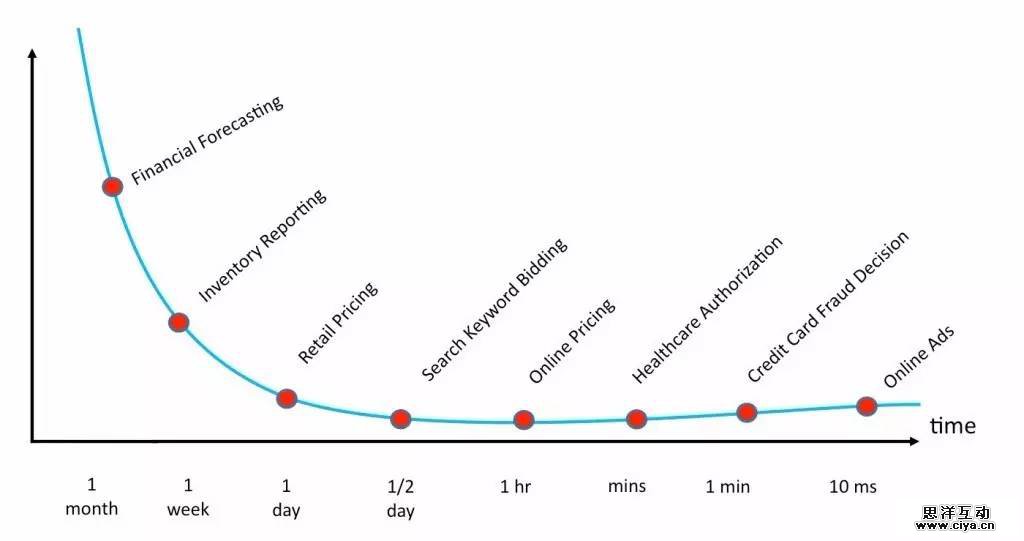商业智能是一个出现了近40年的领域。统计分析和机器学习技术被使用的时间则更长。在这一时期,我们已经提升了我们从数据集中识别关联性的能力,但是做出决策的时间要求正在变短,而数据产生的速度不断增加。举例来说,公司的首席金融官们可能有一个月的时间来创建金融预报,然而一个自动的在线广告平台只有仅仅10毫秒的时间来决定把哪一个数字广告展现给特定的用户(参见图3)。此外,一个首席金融官仅需要参考几十亿字节的数据就可以得出决策,而在线广告系统不得不分析万亿兆字节的数据,大部分的数据还是近实时生成的。