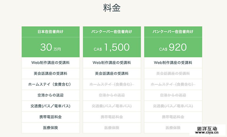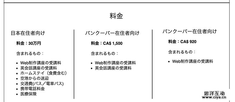 这里举个实际例子。我去参加一个在海外以成为创意家为目标的Frog School,定期举办短期网页设计和锻炼英语能力的讲座。这里有3个费用的计划,最初是像这样上面包含着这服务和费用汇总之后的文本。
