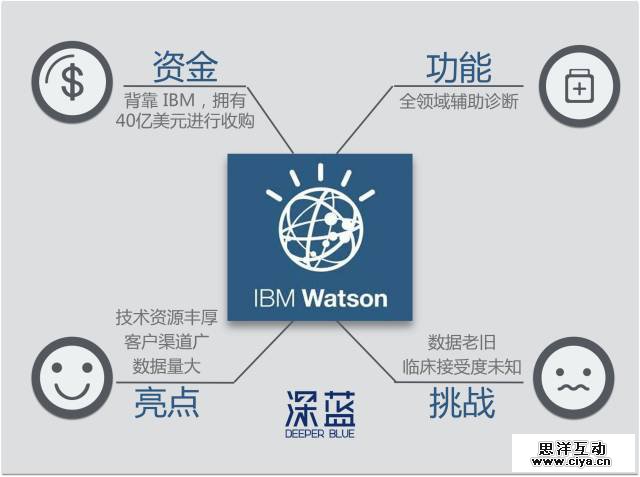 IBM 在人工智能领域深耕多年。早在2006年,IBM 就开始了 IBM Watson 的内部试验。《IBM 官方认知医疗白皮书》这样描述:“Watson 可处理大量医学文献、临床资料和病患医疗记录,并对单个病患提出适当的治疗方案,它还可对临床医生的系列问题提供基于证据的答案。通过节省医师的研究时间。”