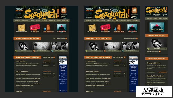 Sasquatch! Music Festival有大量的多媒体内容,包括视频和动态效果,此外网页上加入了一些艺术的手写体和梦幻的图形内容。因此对于这种组合而言,如何在手机和平板电脑上能正确地显示每一块内容就成了一个挑战。
