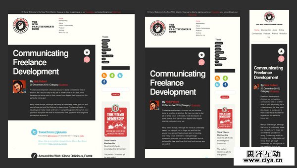 说实在的,Think Vitamin无法吹嘘任何关于它自身的博客设计。它的结构跟其他网站一样。整个网站右侧是一栏单列补充信息,一个网页导航、一个logo、一个搜索框以及一个页尾。