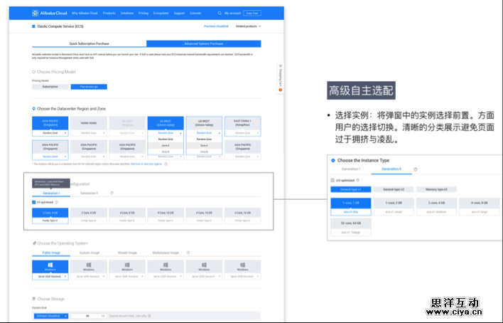 (2)在购买部分,将原先复杂的购买根据用户的类型拆分重构为“快速套餐购买”(将“实例型号” “网络、带宽”“存储”等进行打包,给用用户推荐方案)和“自定义高级购买”两种方式,满足不同级别用户不同的需求,同时也平衡了不同级别用户的能力与挑战(促成心流体验的产生)。