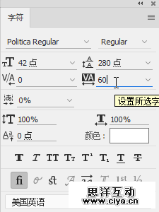 Alt键拖动复制字体图层,改成副标题的文案。在【窗口】中找到【字符】面板调整文字的字间距到合适的间距,将字体大小为42px,文字字间距为60。