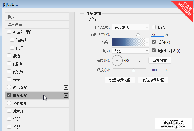 双击图层形状打开【图层样式面板】选择渐变叠加,“混合模式”选择正片叠底,“角度”为90°,“样式”为线性。