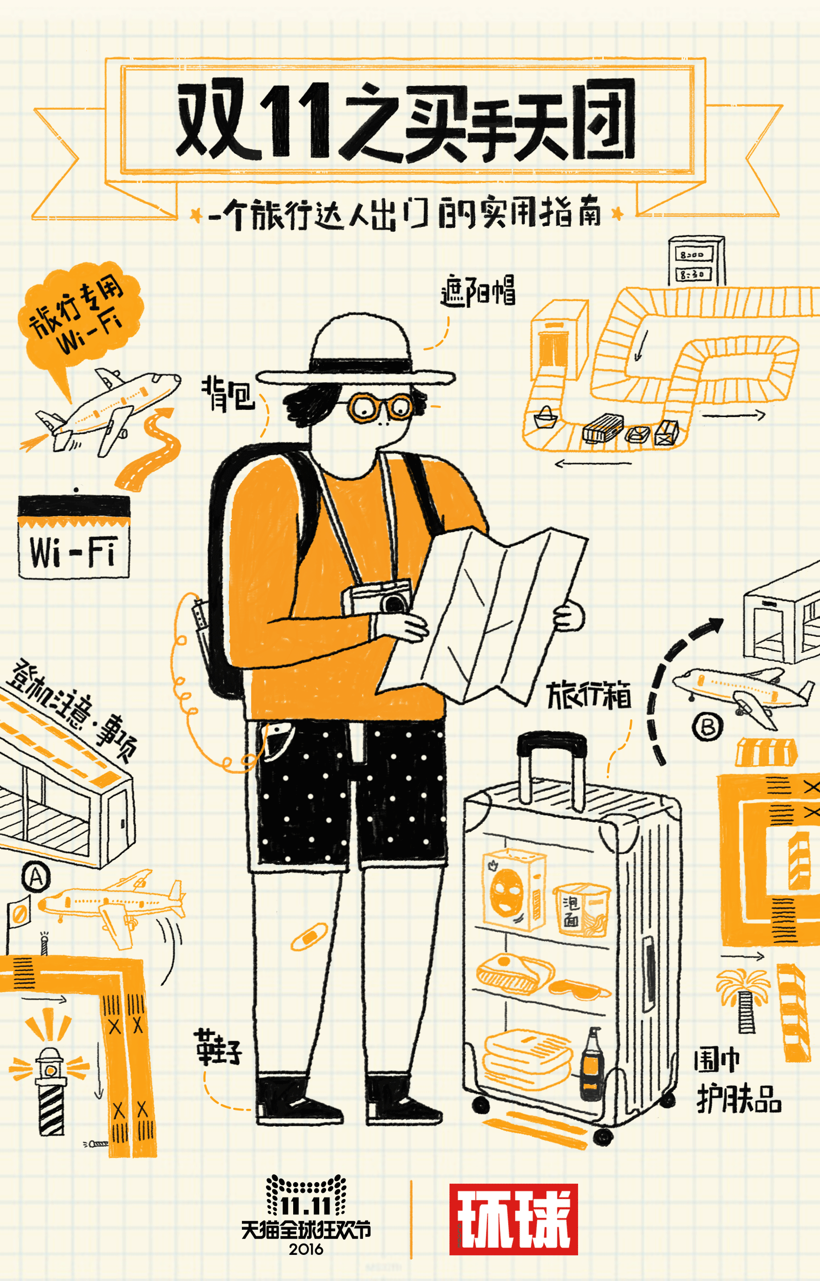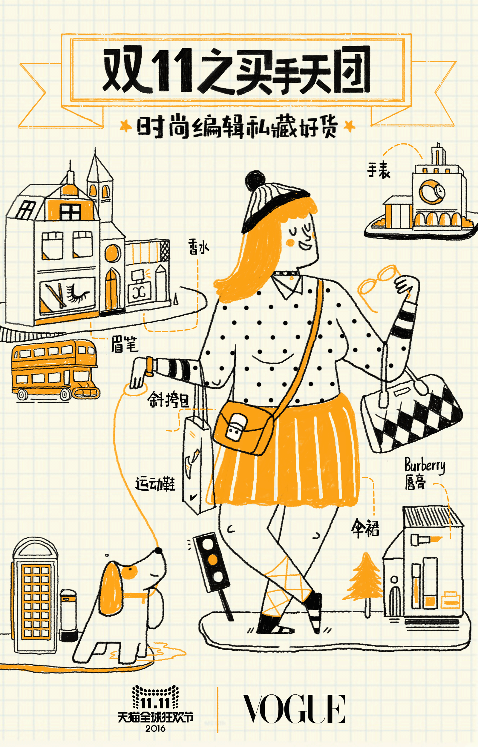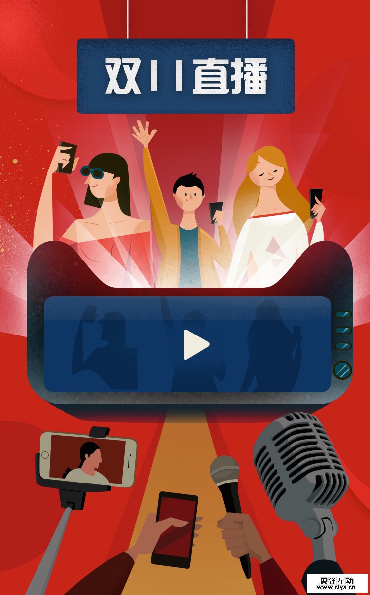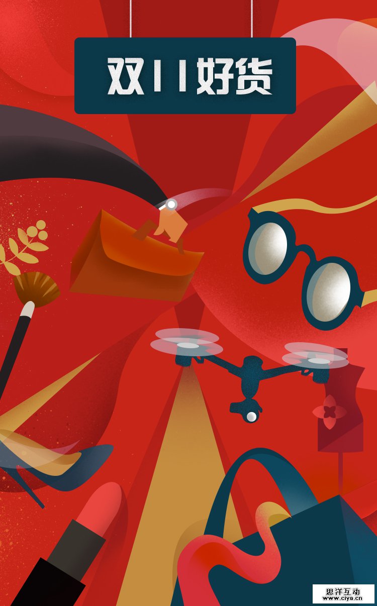 这次我们的双11总攻略不同于往年只是单纯静态图展示的形式,这次我们用欧美复古插画风格,创意将其制作成具有景深动态的,让用户身临其境,感受这一总攻略时间进度上的变化。 媒介投放上我们利用PC页面,无线端H5,加上一支创意视频,同时我们传播推广的渠道也比往年增加了微博微信上的推广和传播。