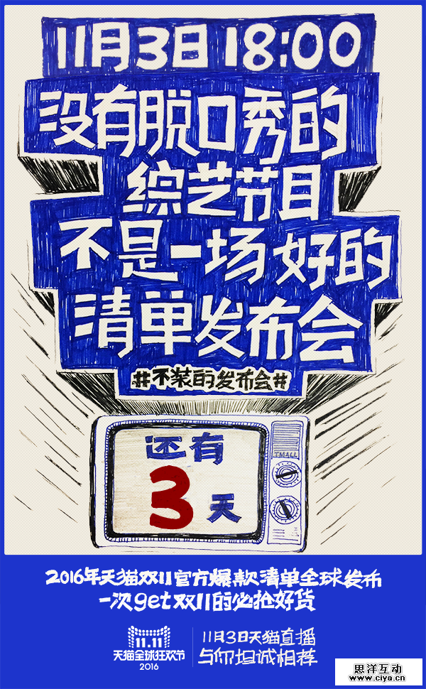 这一系列的海报,我们觉得可以做得更酷一些,结合传统版画纹理的效果和双11天猫公仔形象,我们创意出天猫分别从海陆空及太空出发的视觉特效,画面保持基本两个色调,让视觉更加集中在线条纹理和画面张力上,大繁归于大简。视觉冲击力更强,信息也更直接。这一组海报在微博上的也有大量的讨论和转发。