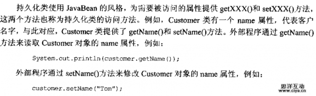 1、持久化类的属性和访问方法 (1)持久化类简介 在Hibernate中持久化类的访问方法有两个调用者,一个是Java应用程序,一个是Hibernate。值得注意的是,Java应用程序不能访问持久化类的p